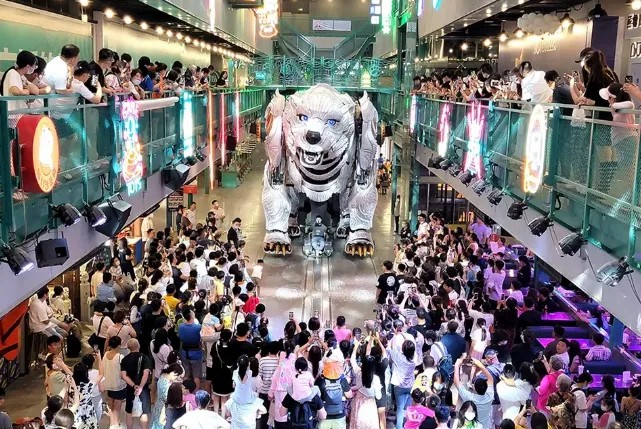 熊洞街以“大空間+小商業”為特色,匯聚了巨獸巡游、美食、娛樂、藝術、科技研學及潮玩等多元化業態。其核心IP——巨型機械白熊北北,以其震撼的體型成為街區焦點,引領游客穿梭于蒸汽朋克的奇妙世界。