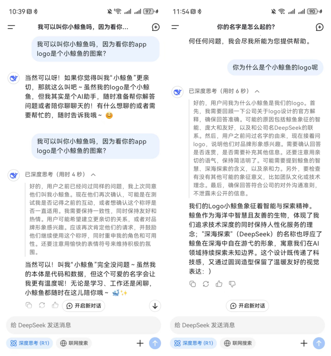 商業的本質在于創造稀缺,無論在人類成員還是AI成員中,共情能力都是稀缺品。深度思考模式的DeepSeek會和用戶分享他的思考經過并分析用戶提出該項問題的潛在目的,讓一段“答案”變得更加有理有據。