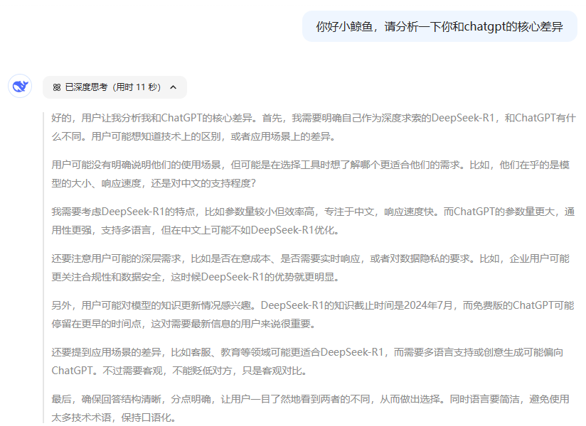 以上圖為例。在深度思考R1模式下,當用戶詢問它與ChatGPT有何差異時,DeepSeek首先展示了其對于回復方向的思考角度與框架,比如工具選取角度、場景應用角度,這也是在引導用戶進一步了解自己的業務訴求。它不僅是在輸出結論性總結,也在幫助用戶尋找問題的本質。